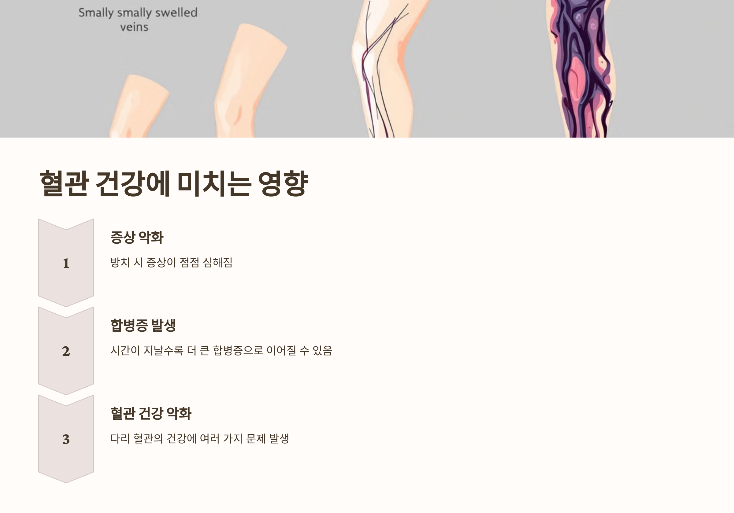 2.혈액 정체: 정맥의 기능이 제대로 작동하지 않으면 혈액이 다리 아래에 쌓입니다. 이렇게 정체된 혈액은 부종과 통증을 유발하고, 혈액 순환에 장애를 일으켜 다리 건강에 악영향을 줄 수 있습니다.