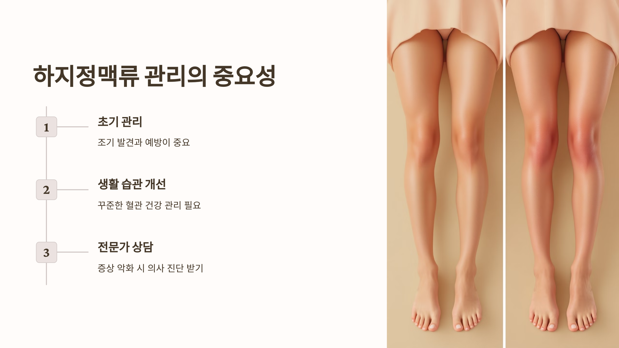 하지정맥류는 혈관 건강에 중요한 영향을 미치며, 초기에 관리하고 예방하는 것이 중요합니다. 생활 속에서 혈관 건강을 위한 올바른 습관을 유지하고, 증상이 악화될 경우 전문가의 진단을 받는 것이 필요합니다. 꾸준한 생활 습관 개선을 통해 하지정맥류 증상을 완화하고 건강한 다리를 유지하는 데 집중하는 것이 좋습니다.