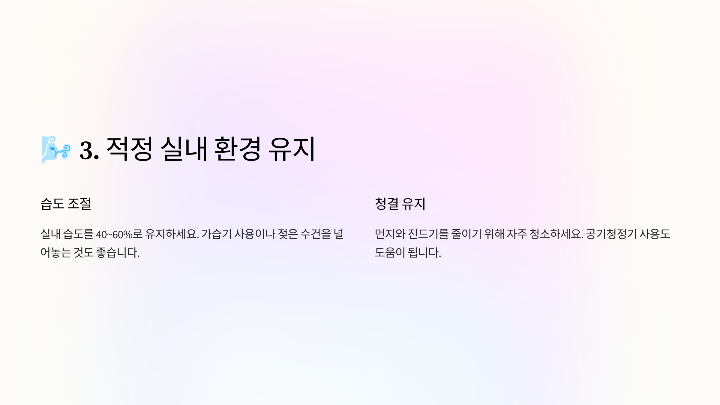 - 가습기를 사용하거나 젖은 수건을 널어놓는 것도 좋은 방법입니다.