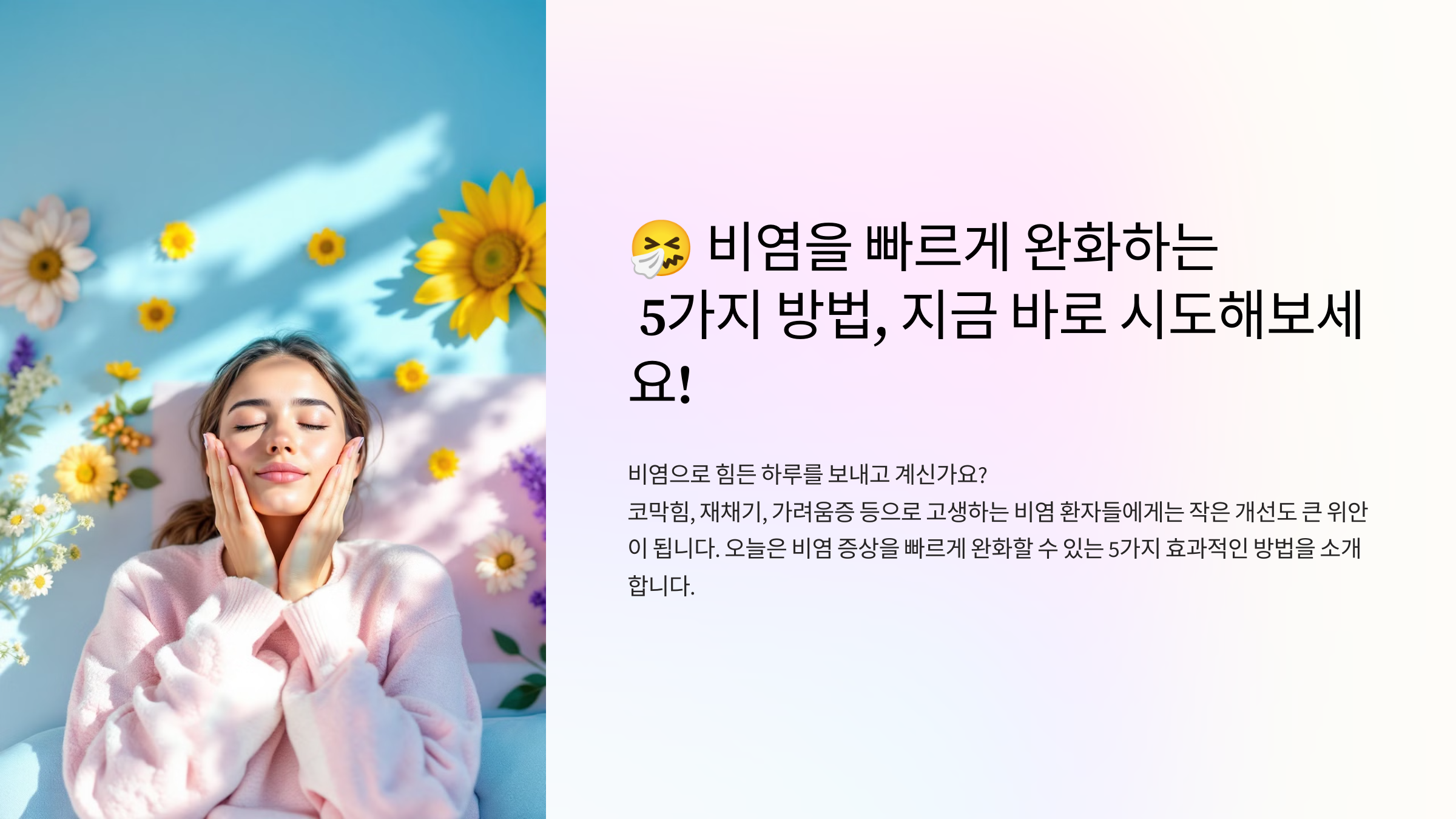 오늘은 비염 증상을 빠르게 완화할 수 있는 5가지 효과적인 방법을 소개합니다.