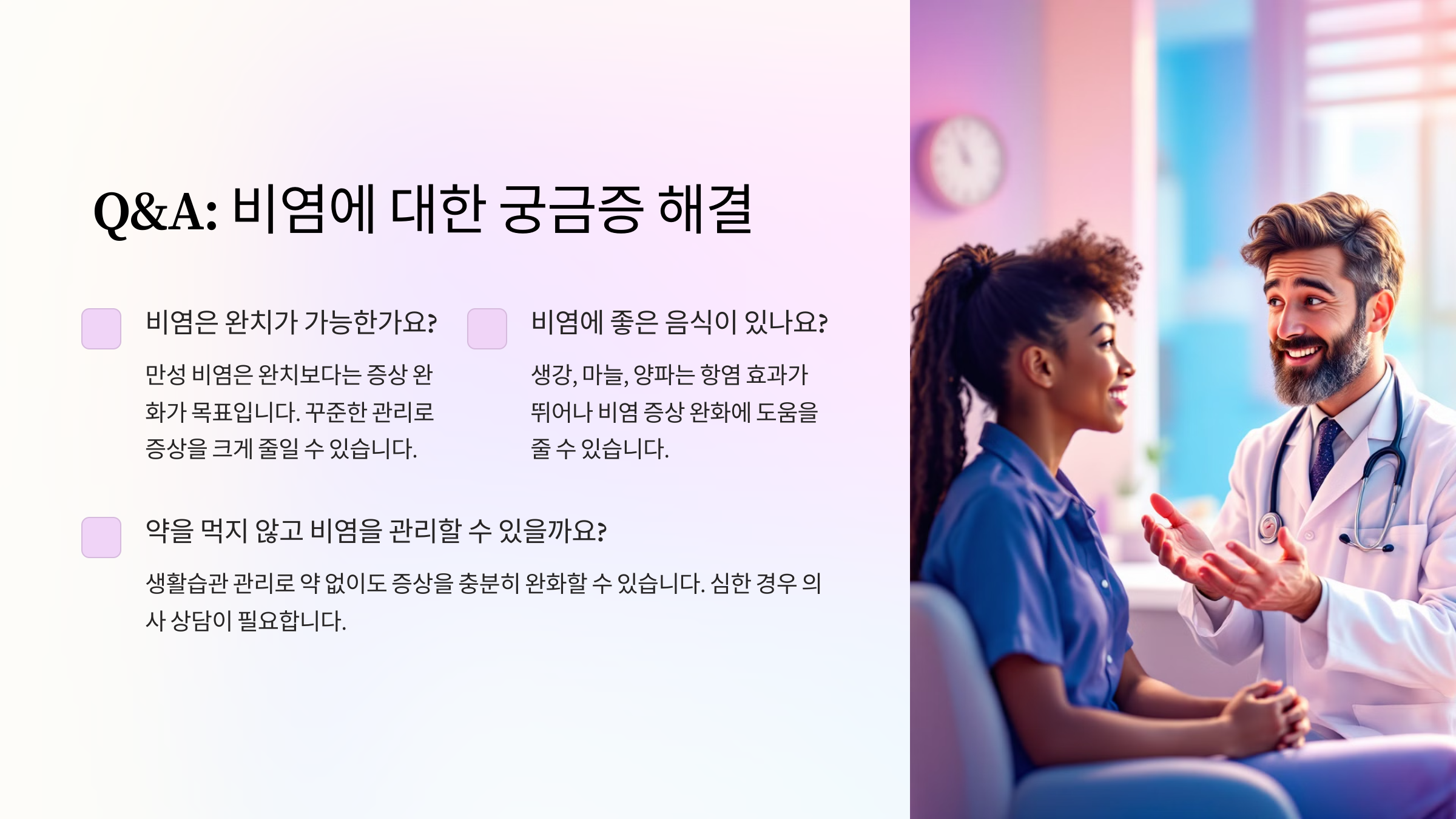 A: 만성 비염은 완치보다는 증상 완화가 목표입니다. 꾸준한 관리로 증상을 크게 줄일 수 있습니다.